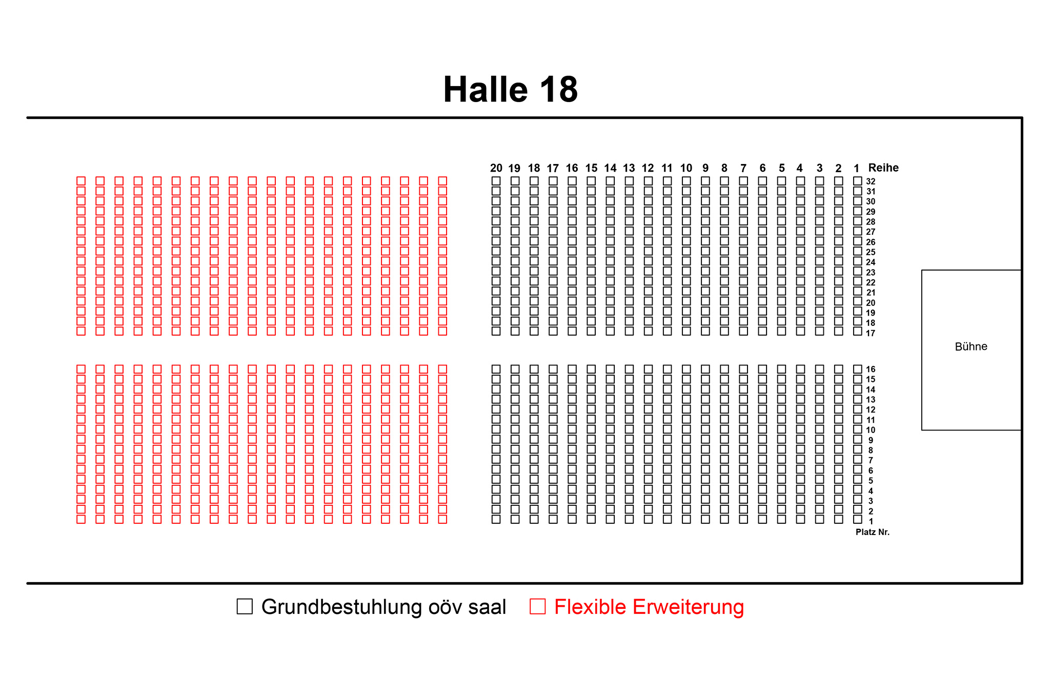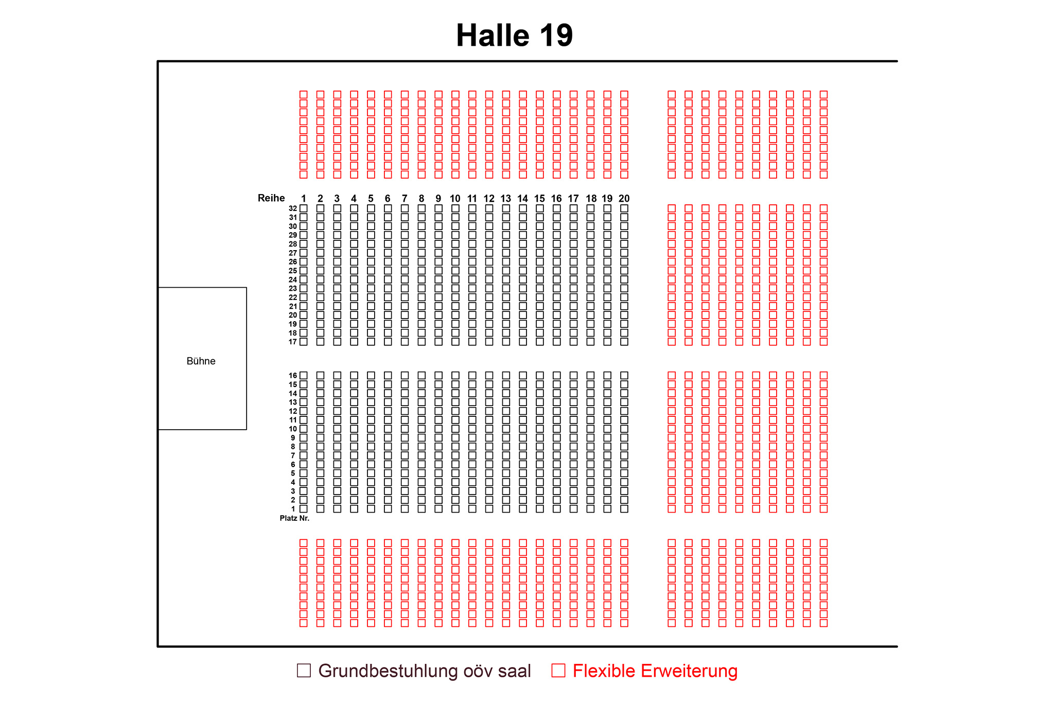 Die bestehenden 20 Sitzreihen können problemlos in die Halle 18 und Halle 19 übernommen und integriert werden. Lediglich die Galerie ist dabei nicht möglich.